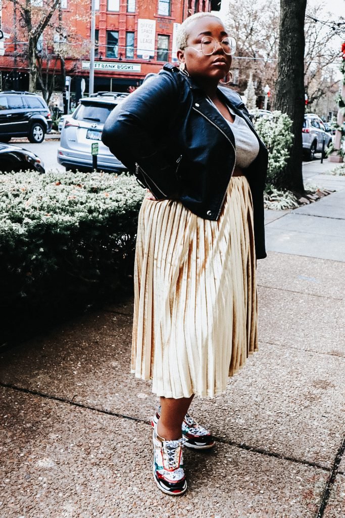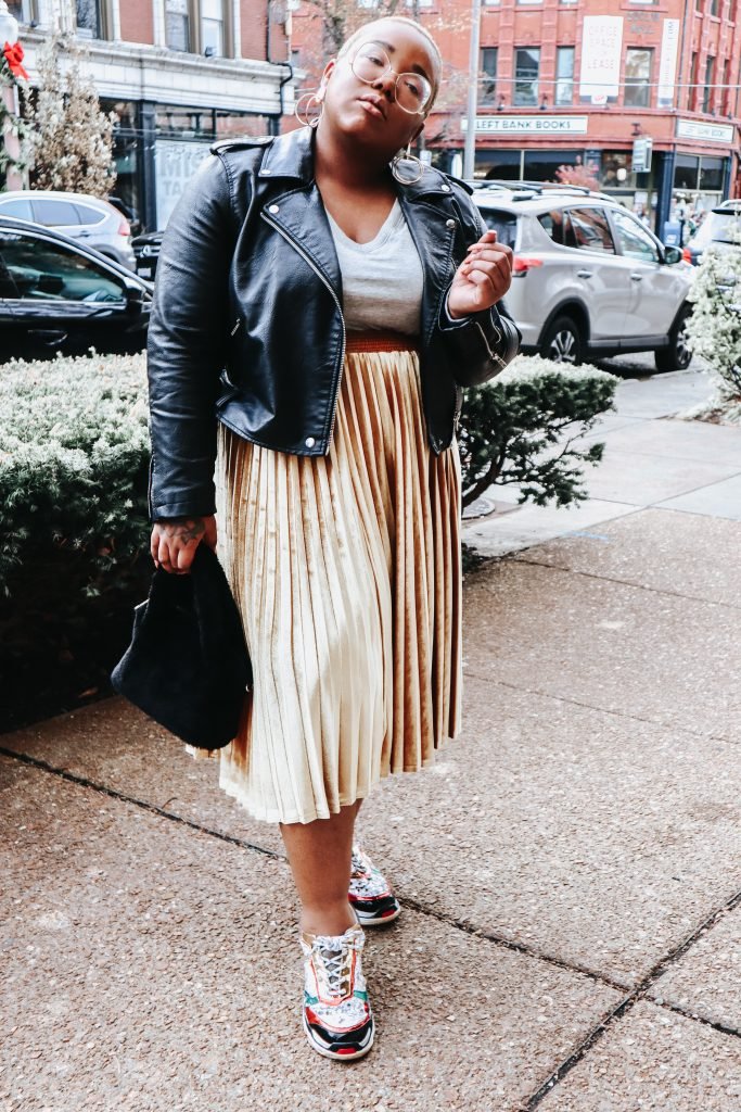 Now the trend is pairing chunky trainer tennis with skirts and dresses. Most people think the trend is stupid, but they’re not me, and I obviously love the trend, pairing my multi colored trainers with this very eclectic velvet skirt. I literally can go from work to the bar without having to change!