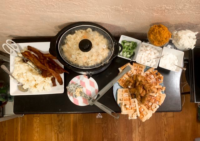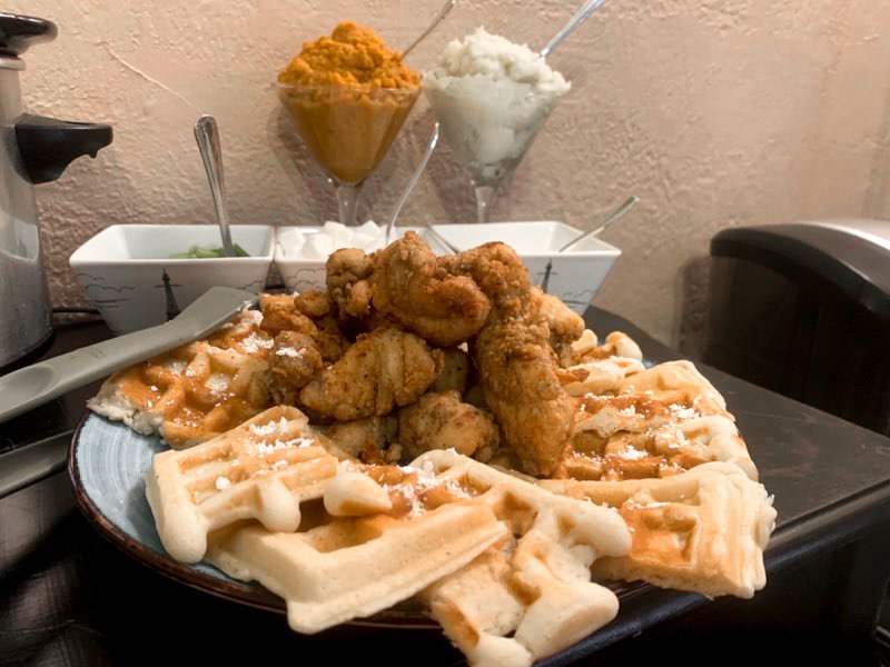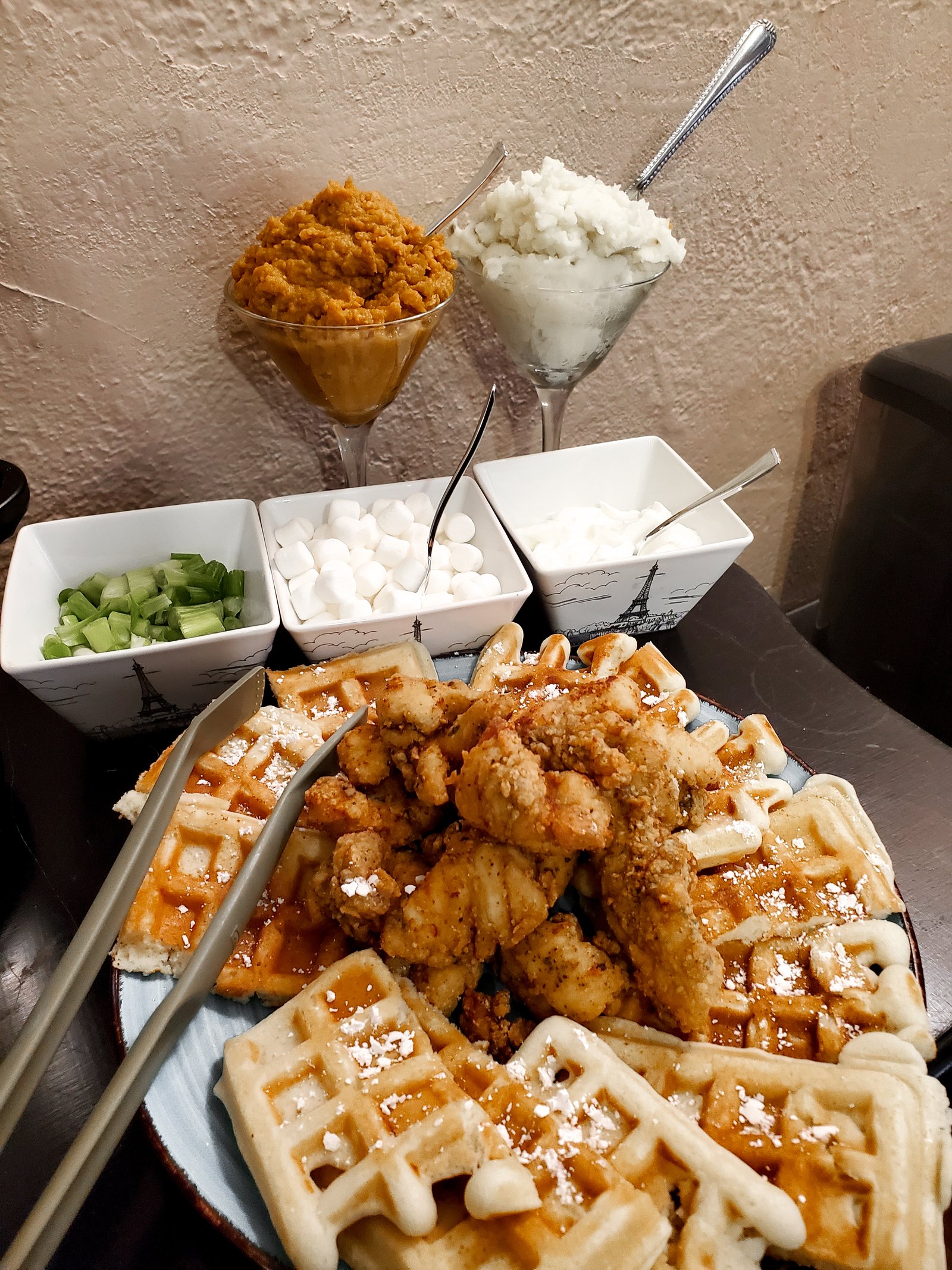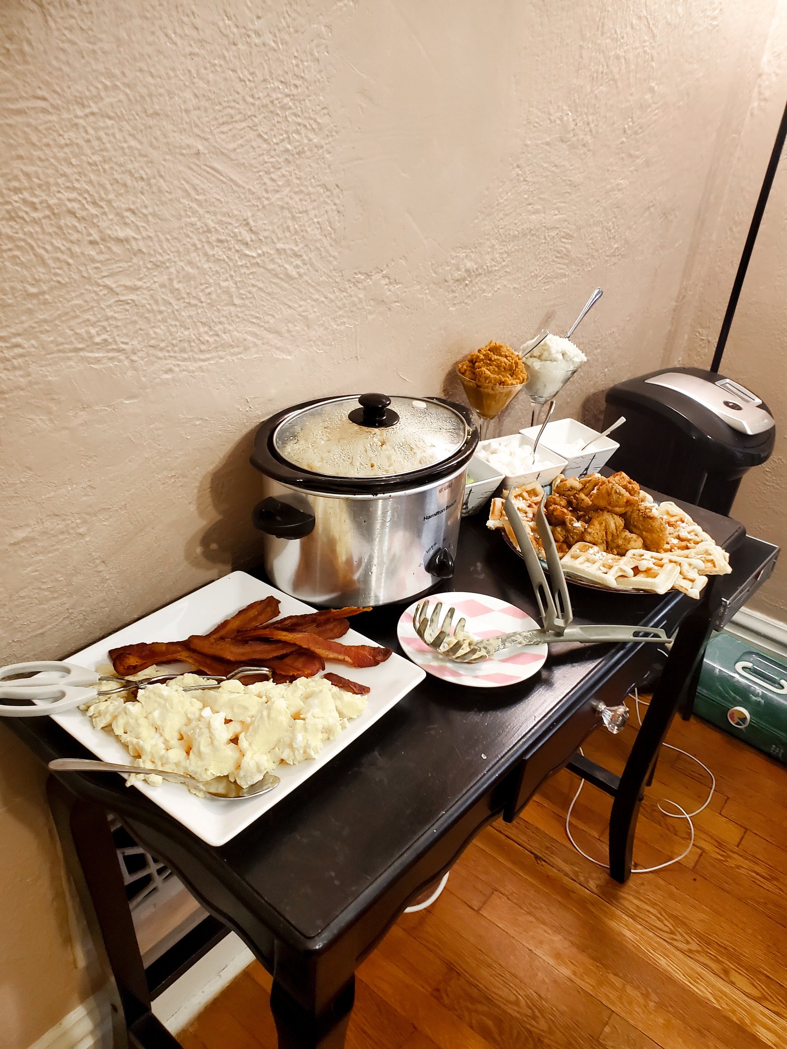 Next, we dived into our brunch prepared by none other than Ms. Erica Bee (love her!). Like when I say she threw down, SHE THREW DOWN IN THAT MF! Chicken & waffles , a mashtini bar, lobster mac and cheese, eggs, bacon, cinnamon rolls, cheese, crackers, olives, brie, JESUS CHRIST I’m getting hungry just thinking about everything we had to eat!